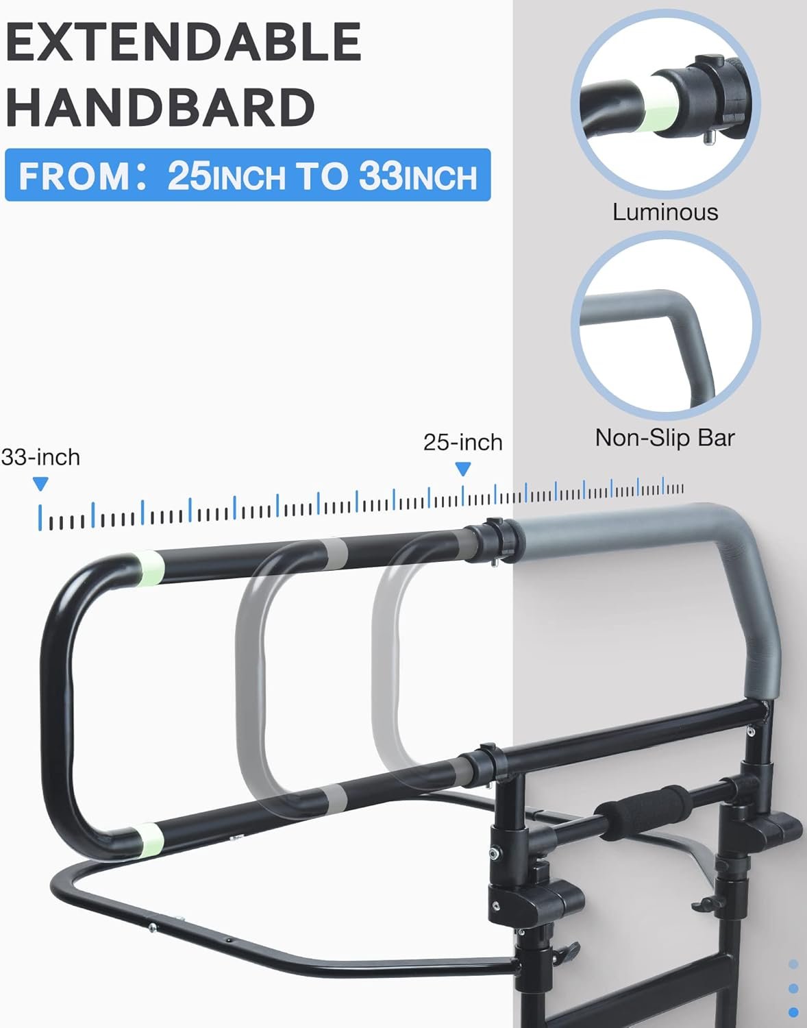 Sturdy Handrail supports up to 330lbs/150kg Hand grab bar extendable from 25-inch to 33-inch New collapsible design for better enter and exist Fits different mattress size: TWIN, DOUBLE, QUEEN, and KING