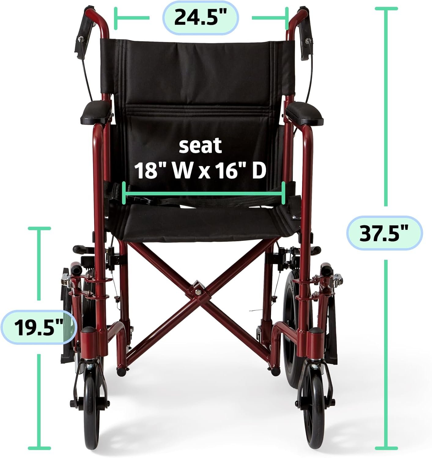 Medline lightweight transport wheelchair with easy-to- use hand brakes allows you to travel safely and easily no matter where your day takes you. It’s the perfect choice for indoor/outdoor use, with larger 12” rear wheels for maneuvering through obstacles; 19” wide seat, comfortable hand grips and a seat belt for safety. Weighs 26 lbs. and features a compact, easy-fold design that fits in most car trunks or the back seat. Dimensions: 30.25”L x 19”W x 37.25”H (assembled); 30.25”L x 12”W x 37.5”H (folded). Features easy-to-clean black, nylon upholstery. No assembly required.