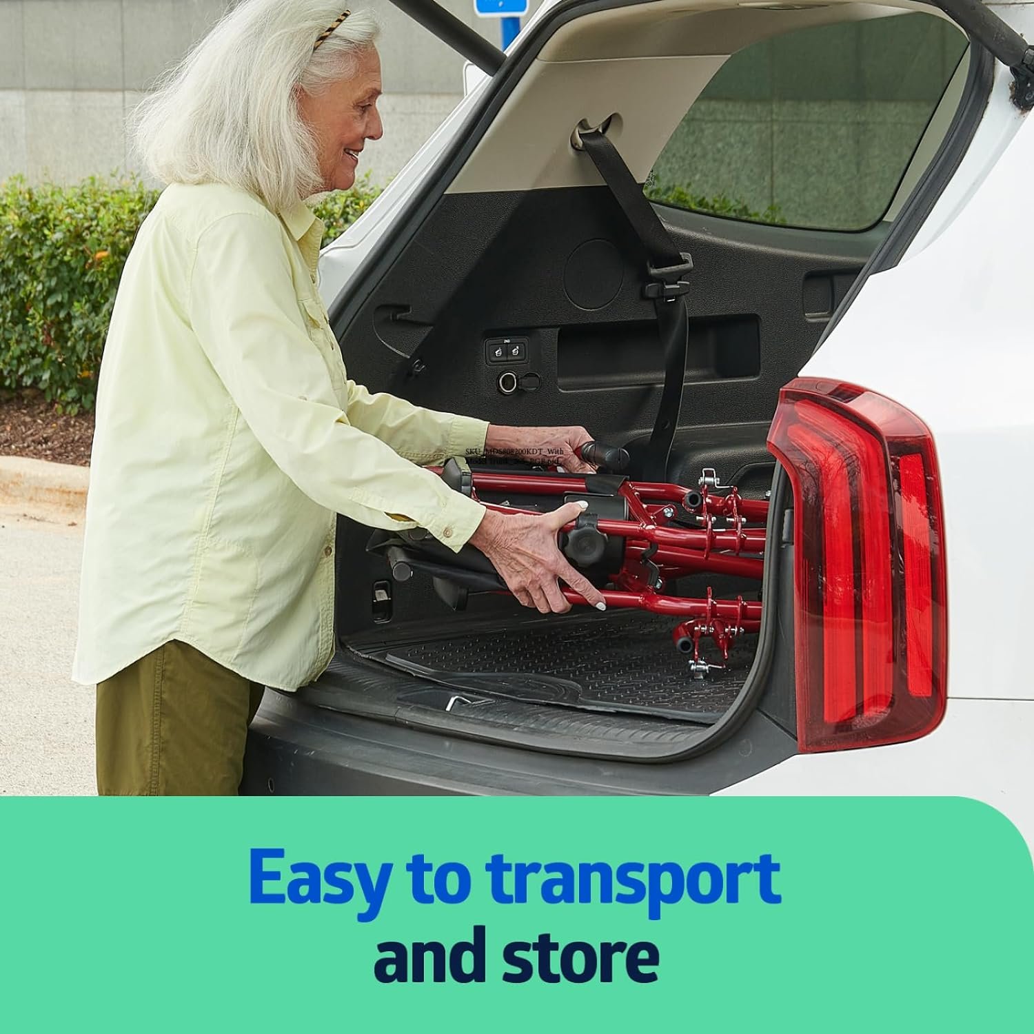My elderly Aunt is in a wheelchair. She can still stand and take a few small steps with support and a guiding hand. This chair has be a life saver for taking her to appointments and getting her out of the house occasionally. It folds very, very easily. It is light enough for me ( an out of shape, middle aged woman) to lift into the trunk of my Prius. My trunk is not super big but with the fold down part of this transport chair’s seat back, it fits perfectly. It maneuvers wells. My only complaint is that my Aunt is very petite and the lap belt does not get small enough to actually secure her. We only use it for outings as it is not supportive enough for her to be in all day long. She needs a real wheelchair at home.